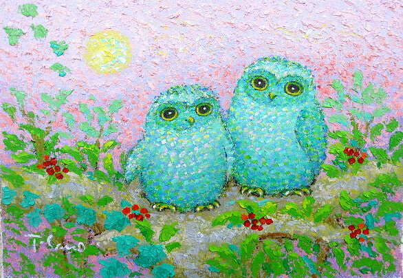 Chieko Sano 的油畫《慶祝貓頭鷹》